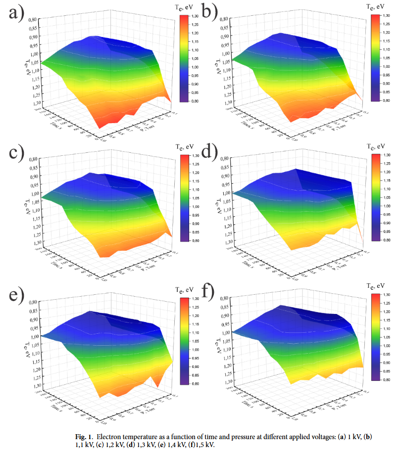 В исследовании для сбора спектров эмиссии плазмы использовался спектрометр ATP2000. Анализируя соотношения интенсивностей спектральных линий, исследователи оценили временную эволюцию электронной температуры. Прибор располагался перпендикулярно разрядной трубке и фокусировался на области положительного столба постоянного тока тлеющего разряда. Результаты показали, что электронная температура достигала своего максимального значения (1,3 эВ) на начальной фазе и постепенно снижалась по мере образования и роста наночастиц. Этот процесс тесно коррелировал с изменением размера и концентрации частиц.