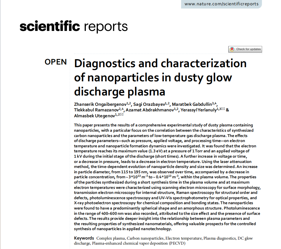 Онгайбергенов, З., Оразбаев, С., Габдуллин, М. и др. Диагностика и характеристика наночастиц в плазме тлеющего разряда пыли. Sci Rep 15, 37530 (2025).