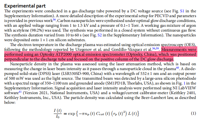 В недавнем исследовании, опубликованном в журнале Scientific Reports (издание Nature Portfolio), исследователи успешно использовали волоконно-оптический спектрометр Optosky ATP2000 для мониторинга температуры электронов и спектрального анализа в процессе синтеза углеродных наночастиц в плазме постоянного тока тлеющего разряда, что обеспечило важную поддержку данных для контролируемого синтеза наноматериалов.